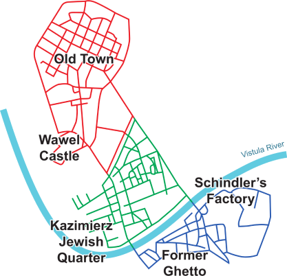 The Cracow Ghetto was established in 1941 as part of the Podgórze district. Three thousand Poles were resettled from the 20h area and in their place fifteen thousand Jews were crowded in. The ghetto was encircled with a high wall and could be entered through four gates.